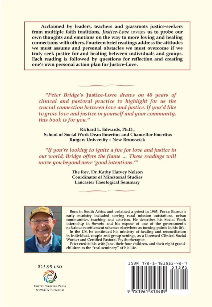 Acclaimed by leaders, teachers and grassroots justice-seekers from multiple faith traditions, Justice-Love invites us to probe our own thoughts and emotions on the way to more loving and healing connections with others. Fourteen brief readings address the attitudes we must assume and personal obstacles we must overcome if we truly seek justice for and healing between individuals and groups. Each reading is followed by questions for reflection and creating one’s own personal action plan for Justice-Love.